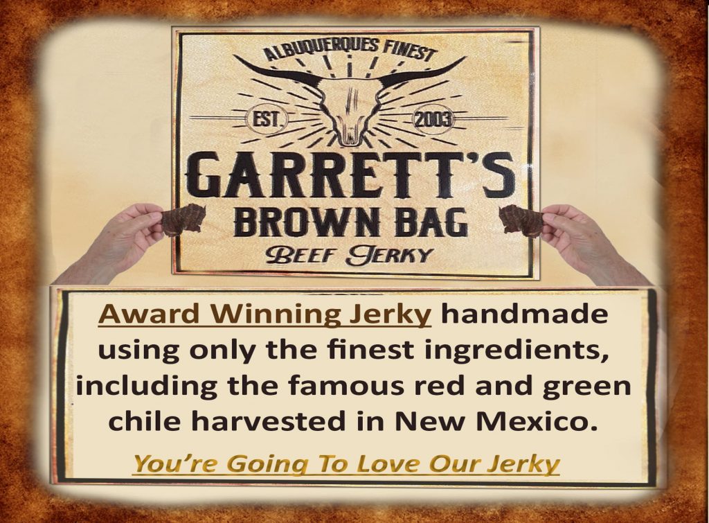 We take great pride in our jerky which is handmade using only the finest ingredients, including red and green chile harvested in New Mexico. It is made from top round and is thinly sliced by hand.